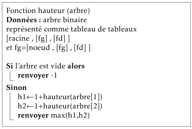 xxxxxxxxxxdef noeud(nom, fg = None, fd = None) : return {'racine': nom, 'fg' : fg, 'fd': fd}# création des noeuds (chaque noeud est un dictionnaire)k = noeud('k')f = noeud('f')e = noeud('e', k, None)b = noeud('b', e, f)m = noeud('m')j = noeud('j', m, None)i = noeud('i')d = noeud('d', i, j)h = noeud('h')c = noeud('c', None, h)a = noeud('a', c, d)racine = noeud('r', a, b)# création de l'arbre (construction récursive)def construit(arbre) : if arbre == None : return [] else: return [arbre['racine'],construit(arbre['fg']),construit(arbre['fd'])]arbre1=construit(racine)print(arbre1)xxxxxxxxxx### Hauteur de l'arbre**Définitions**Hauteur d’un noeud : la hauteur(ou profondeur ou niveau ) d’un noeud X est égale au nombre d’arêtes qu’il faut parcourir à partir de la racine pour aller jusqu’au noeud X.La hauteur (ou profondeur) d’un arbre est égale à la profondeur du noeud le plus profond.Voici l'algorithme du calcul de la hauteur :<img src="https://www.nsi-ljm.fr/images/ab_hauteur.png" width="400px">**Écrire la fonction hauteur**Définitions